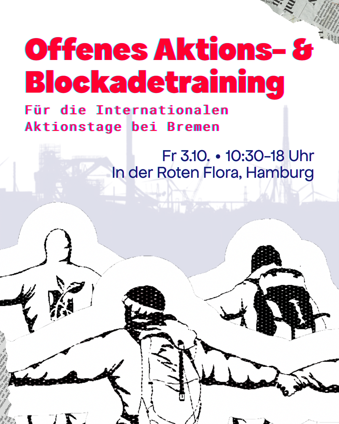 Wir laden euch herzlich zum offenen Aktionstraining am Freitag, 3. Oktober 2025 in der Roten Flora ein! Eine Woche später wollen wir in Bremen an den Aktionstagen „Disrupt Food System“ teilnehmen und uns auch für antifaschistische Proteste wie Widersetzen Gießen Ende November vorbereiten.